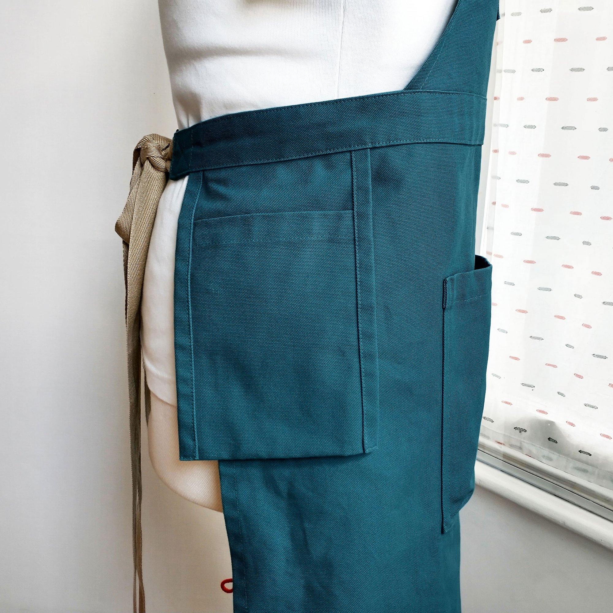 Working in my studio in hilly-leafy South-East London, I make aprons in small batches using cotton canvas, denim or drill - fabrics that are natural, washable and durable. Careful attention to detail, strength of construction and beautiful stitching result in a quality of finish simply not possible in mass production. I cut fabric economically, minimising waste and saving the small remnants to make one-of-a-kind bags for my ‘Boro Collection’.
