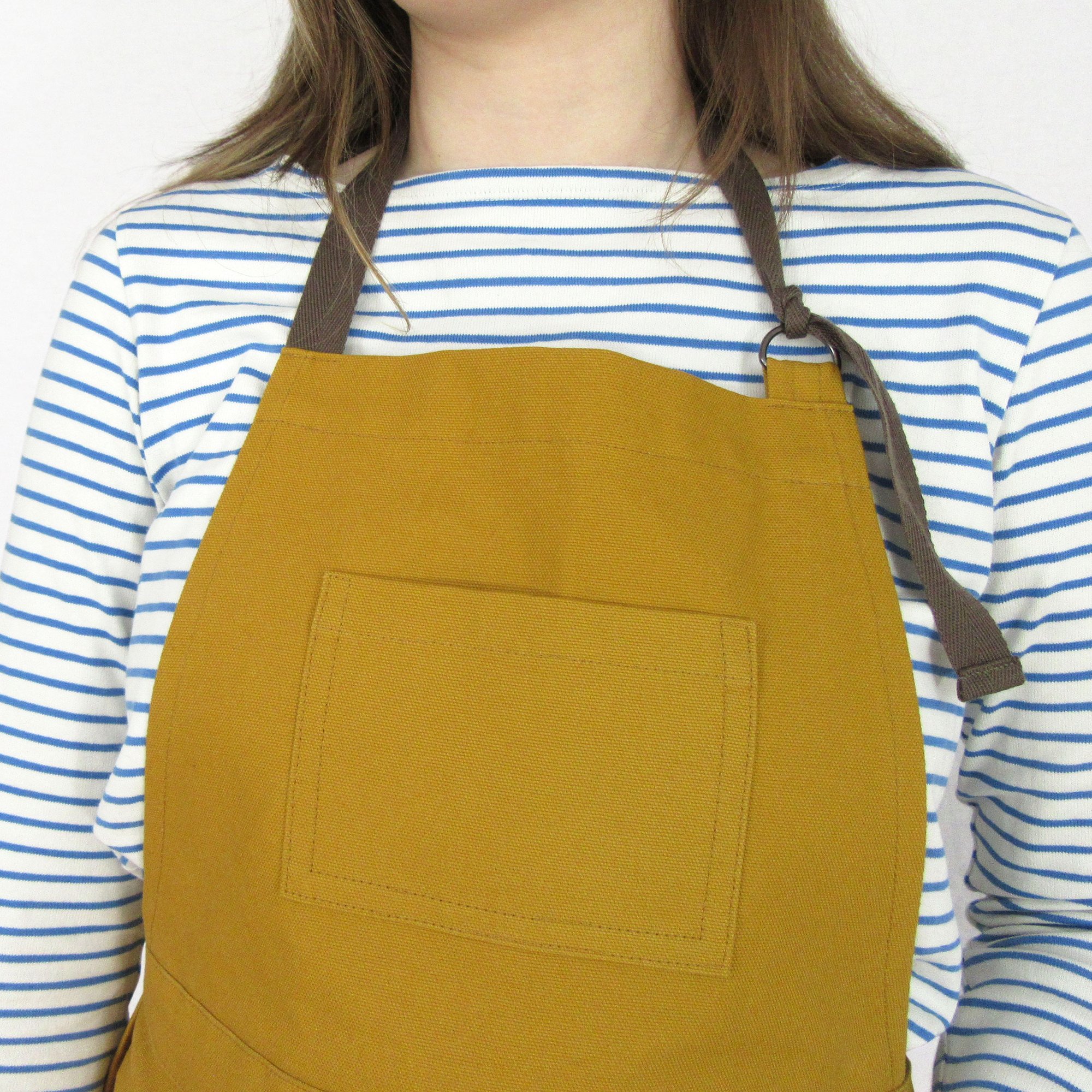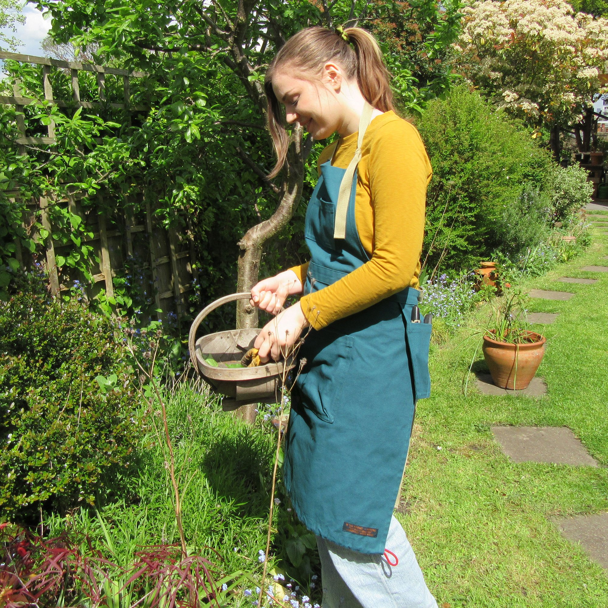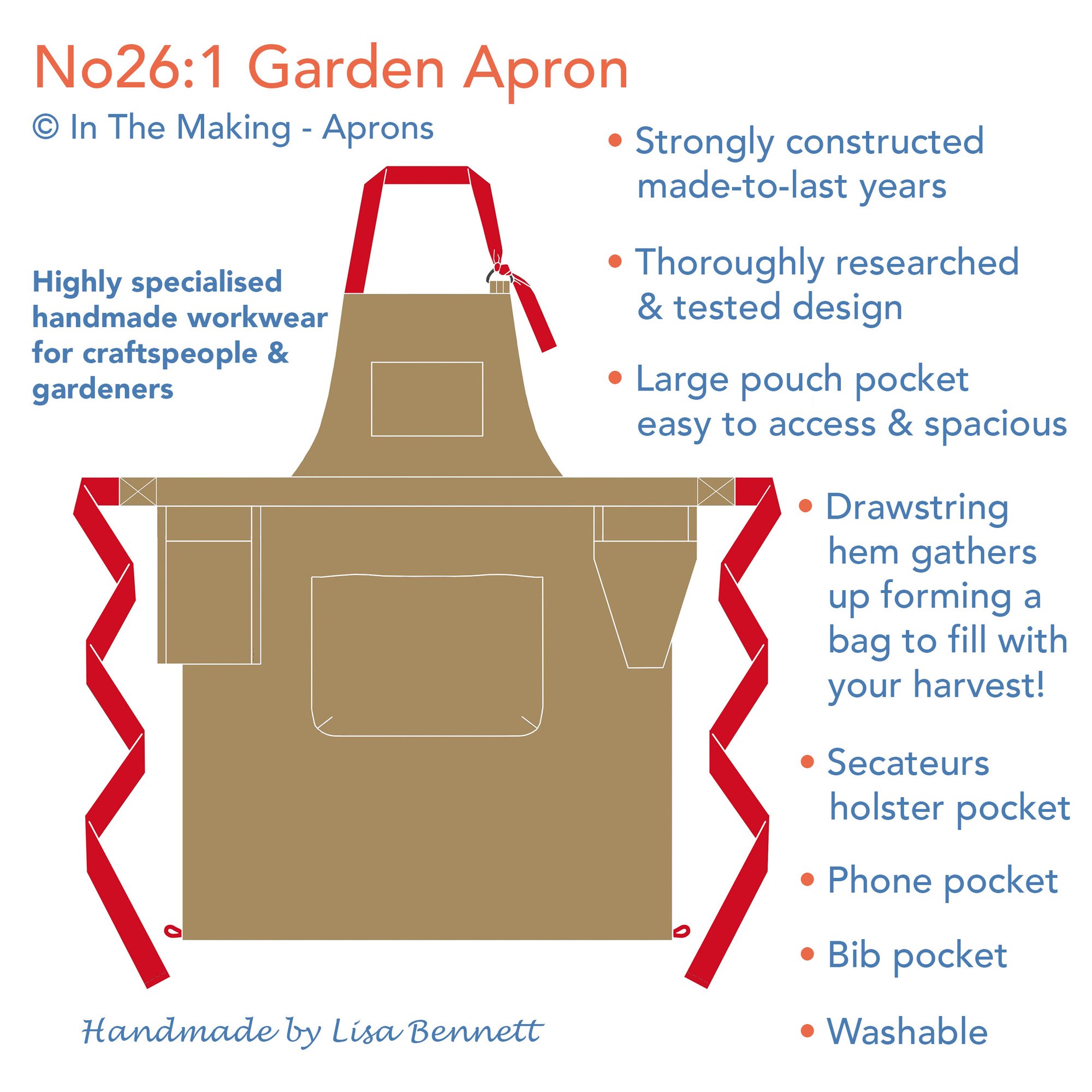 KEY FEATURES: Tough medium-heavyweight canvas • Large pouch pocket • Holster pocket for secateurs • Phone pocket • Bib pocket • Drawstring hem skirt for gathering produce • Adjustable neck tie knots through D-ring • Soft herringbone ties • Fits wide size range • Strongly constructed • Thoroughly researched & tested design • Sustainable making • No plastic/no leather • Handmade by Lisa Bennett
