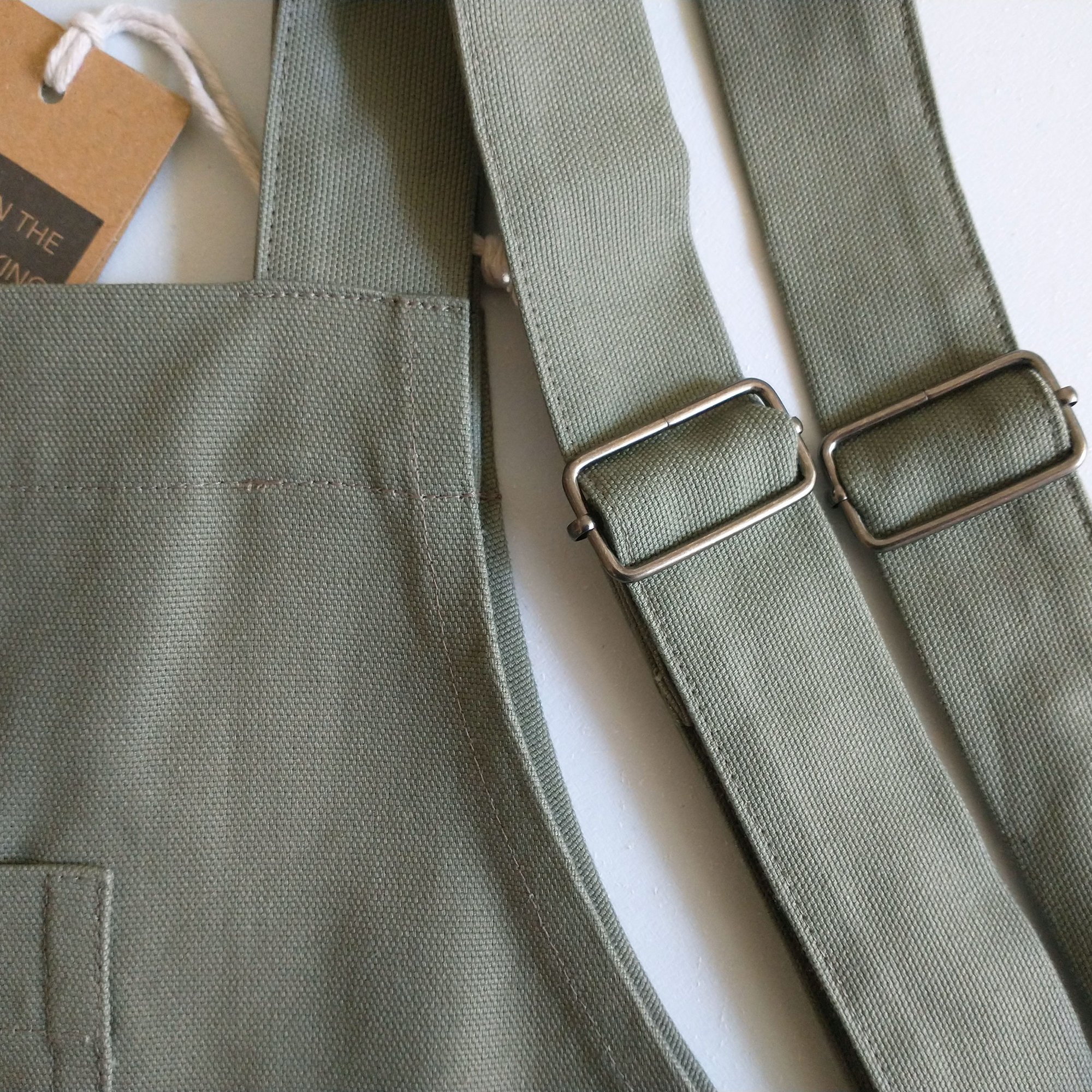 KEY FEATURES: Suitable for potters, jewellery designers, artists, craft makers • Split Leg skirt • Adjustable crossback straps • Tough medium-heavyweight cotton canvas • Red connector tabs • Very good coverage wrapping around the body • No ties around the neck • Good size bib pocket • Large skirt pocket • Tool loop for hanging cleaning cloth • Strongly constructed • Thoroughly researched & tested design • Sustainable making • No plastic/no leather • Handmade by Lisa Bennett at 'In the Making - Aprons' design studio