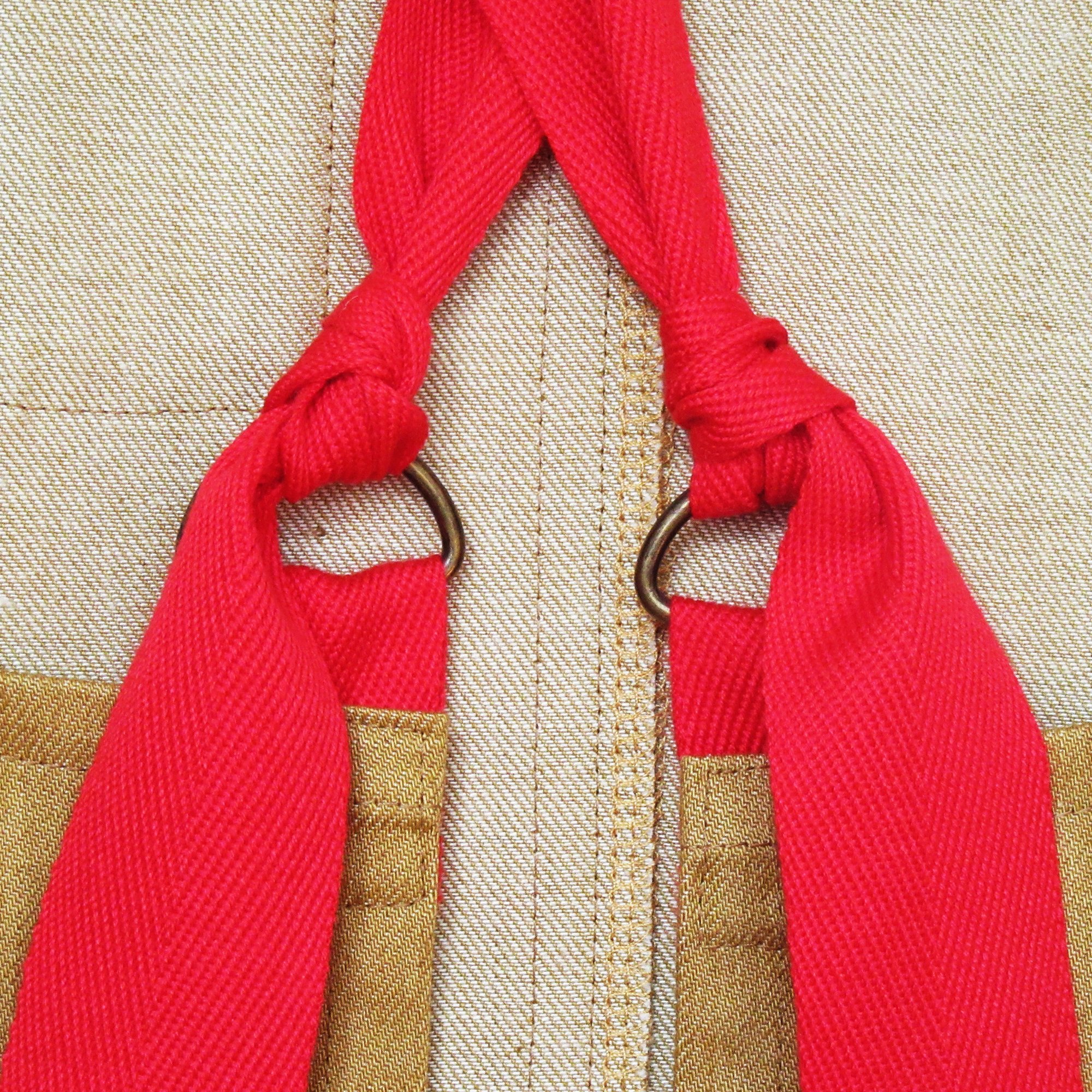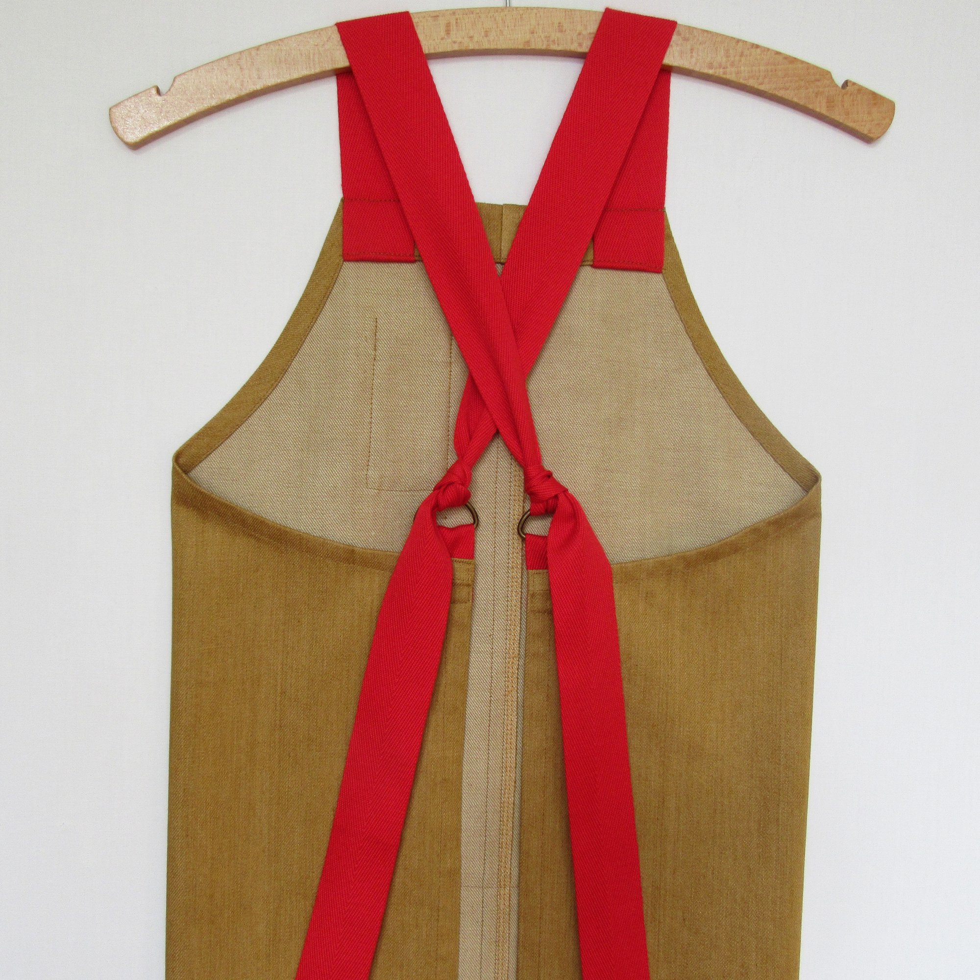 Ochre Denim Apron with Red Crossback Straps. Adult and Child Sizes No7