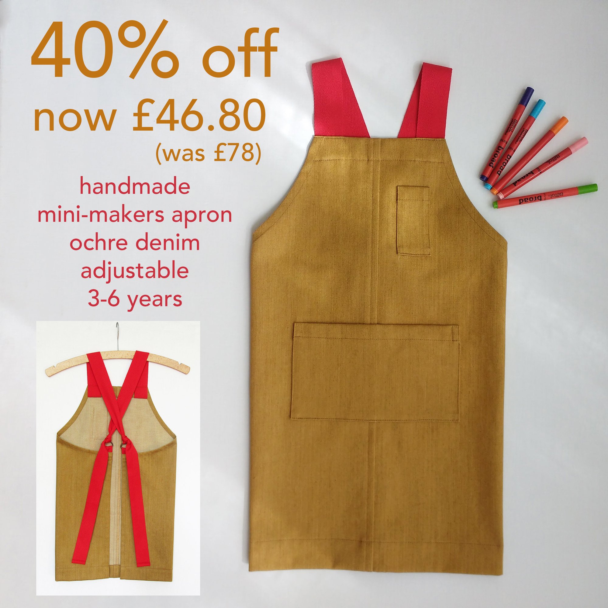 Incredibly comfortable studio apron in a beautiful, yet tough, golden denim with bright red straps - a genuinely useful gift for enthusiastic potters, painters and artisan makers and their litle helpers! Featured 1st of '10 Best Aprons' feature in The Evening Standard, September 2018. Easy to wear all day long it adjusts to fit over lots of layers in a chilly studio, and equally useful at home or in the garden - it's beautifully sewn, thoughtfully designed and made-to-last. The mini-makers version for children aged 3-6 years, is made from offcuts of ochre denim leftover from making adult size aprons.