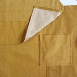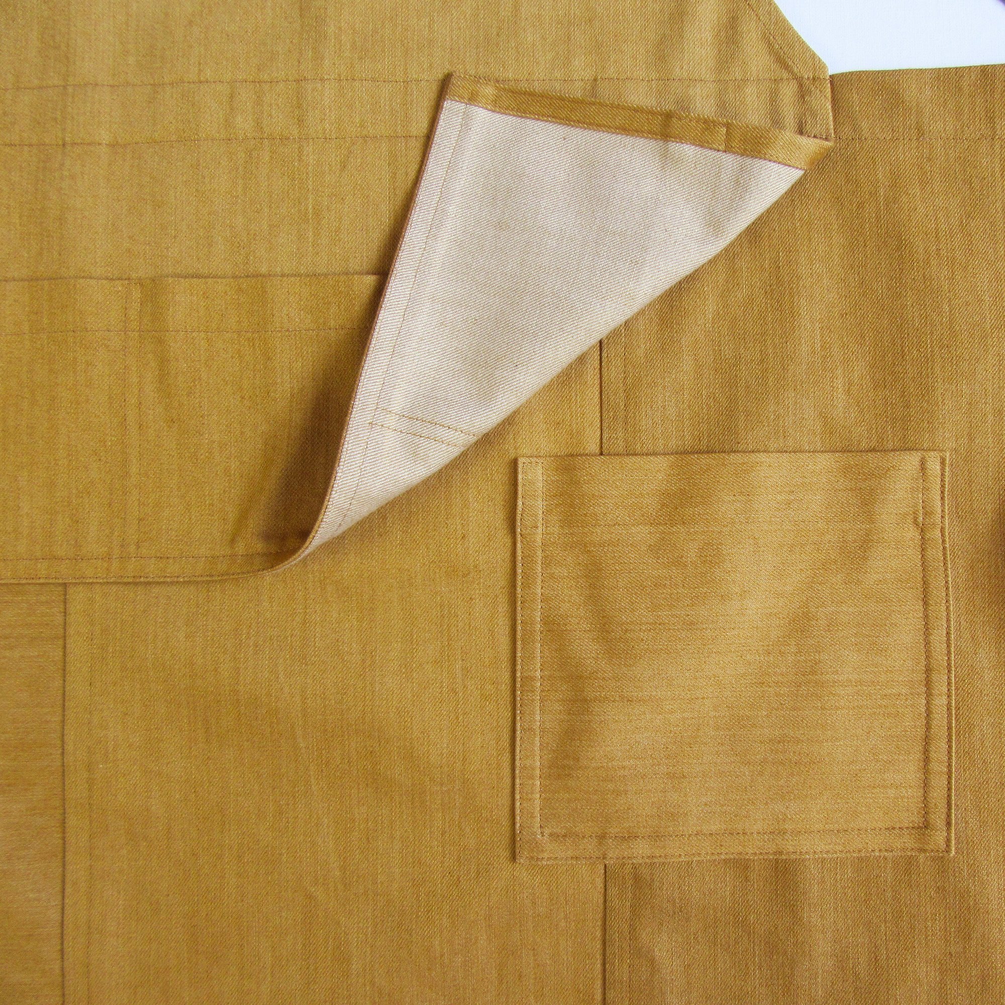 Unusual and striking, golden colour denim work apron for artists, makers and gardeners. One-of-a-kind it's pieced together using remnants of cloth leftover from making other aprons in the range. Made in tough but soft heavyweight cotton it's carefully designed for work, studio and garden use - the bib has a row of 3 pockets overhanging the apron skirt, for small tools, seed packets, bits and bobs, whilst the skirt has a roomy side pocket. Adjustable straps give all the comfort of a crossback apron combined with the snug fit of a tie apron, or just leave loose for an easy-fit. Beautifully sewn, thoughtfully designed and made-to-last, this apron is highly specialised craftsperson's workwear.
