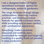 ABOUT: This No25:1 design came about from requests from clients who loved the pleats of the No14:2 apron but wanted an easy-fit crossback style. It took several years to complete this design including experimenting with different fabrics which offer a softer drape than the slightly stiffer canvas I normally use.