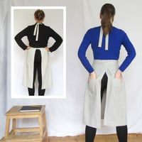 ABOUT: This No14:2 design came about after feedback from various makers who prefer a more 'secure-fit' apron, but still needed ease of movement for their legs. The solution was a tie waistband and neck ties with a generously pleated skirt, later a split leg feature was added to the design. It has been a really popular design partly I think because it is such an attractive as well as functional style.