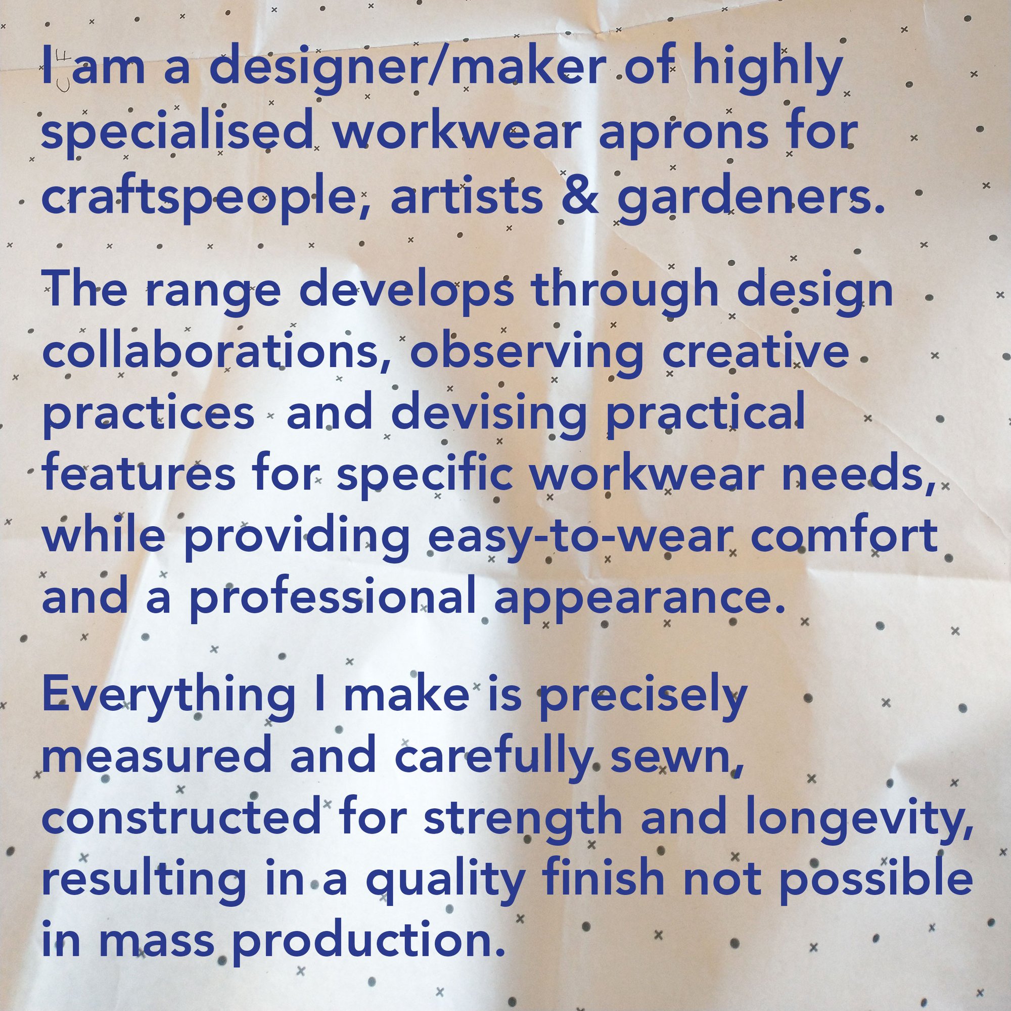 ABOUT: This apron was designed for printmakers and jewellery designers in mind, my aim was a simple, really easy-to-wear studio apron. It's a fairly classic shape but with adjustable crossback straps and a carefully arranged set of different size pockets.