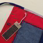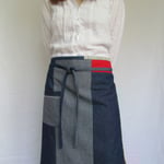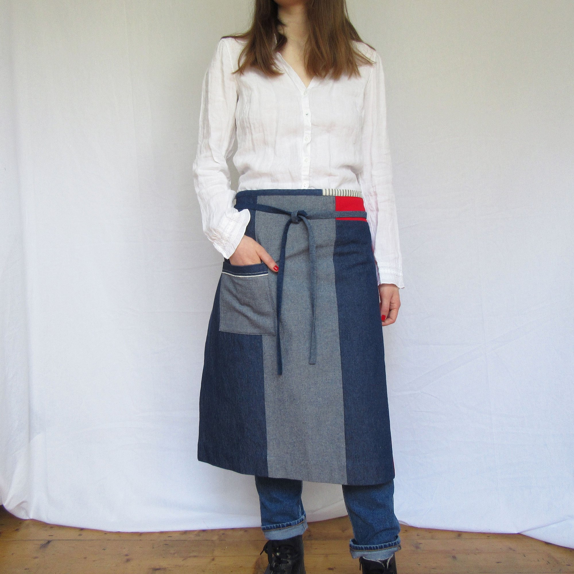 One-of-a kind denim patchwork apron made using 10 fabric remnants, carefully pieced together - balancing the different blue denim tones and complementing with contrasting ticking stripe and red canvas panels, to produce one individual and highly unusual apron. Inspired by Japanese Boro clothing and vintage French and American rustic aprons, my Boro Collection reduces waste whilst creating something useful and unusual that will last for years to come.