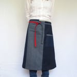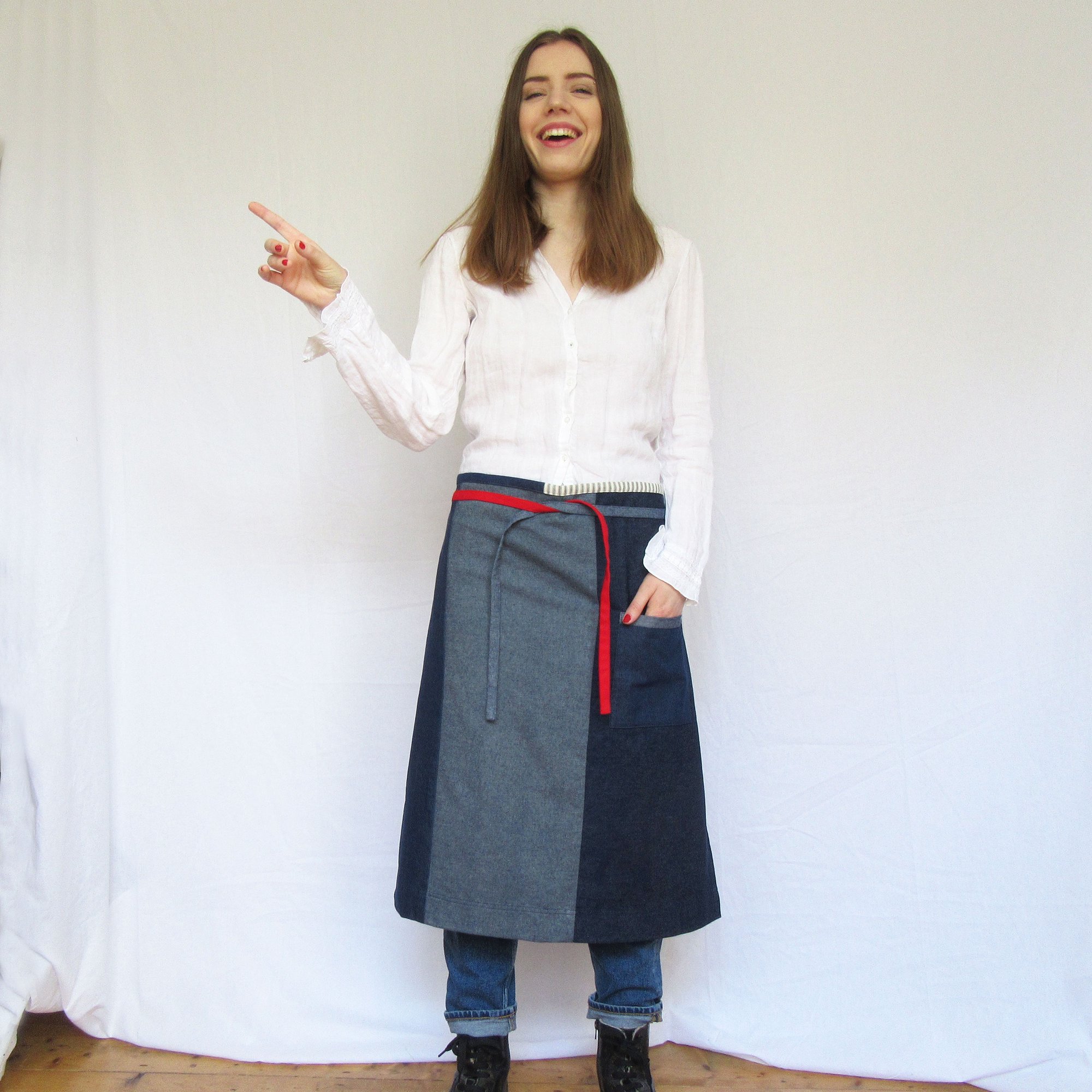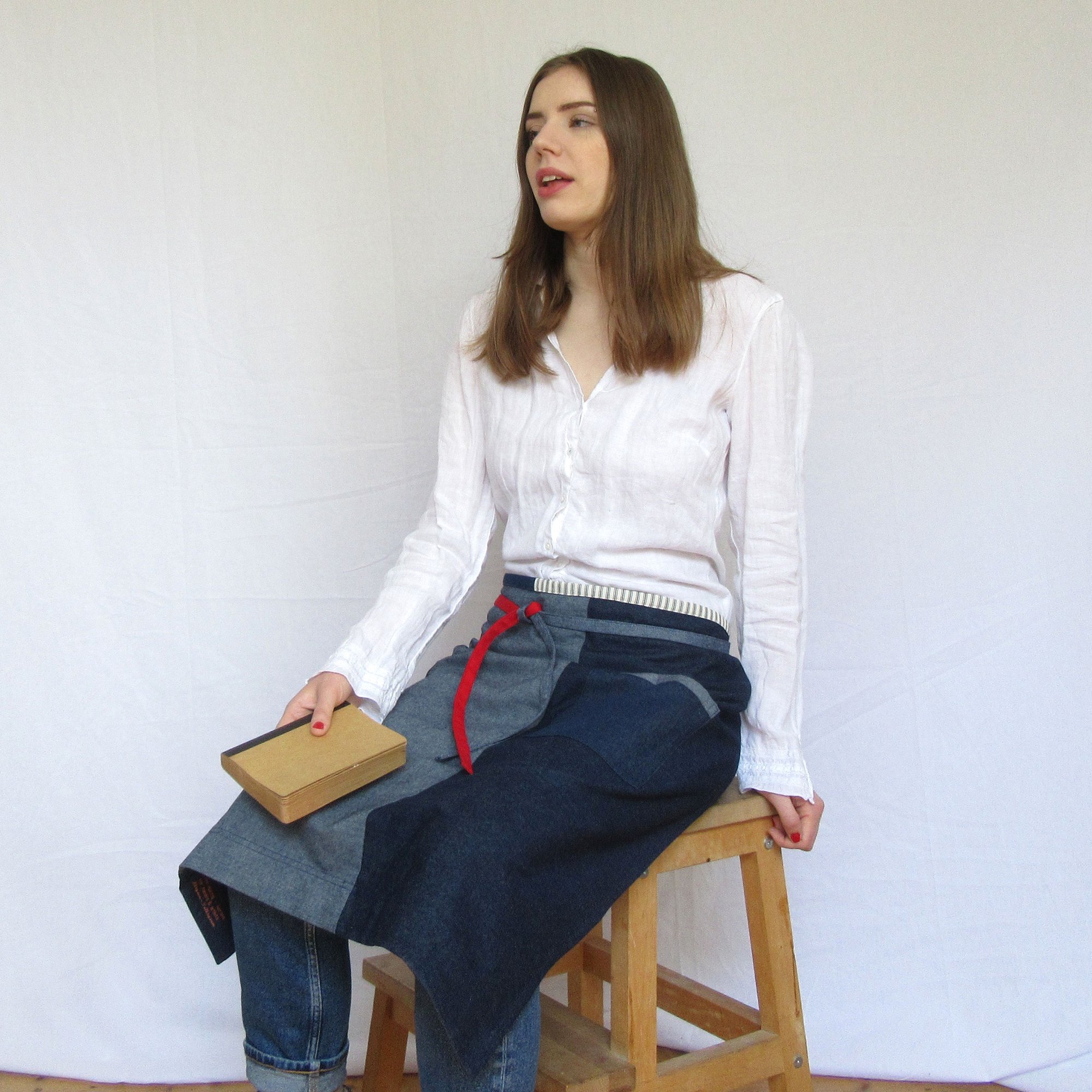 One of a kind, denim patchwork made from 8 different fabric remnants pieced together, balancing blocks of different blue denim tones which are complemented with contrasting ticking and red canvas, to produce one individual and unusual apron. Inspired by Japanese Boro clothing and vintage French and American rustic aprons, my Boro Collection reduces waste whilst creating something useful and unusual that will last for years to come.